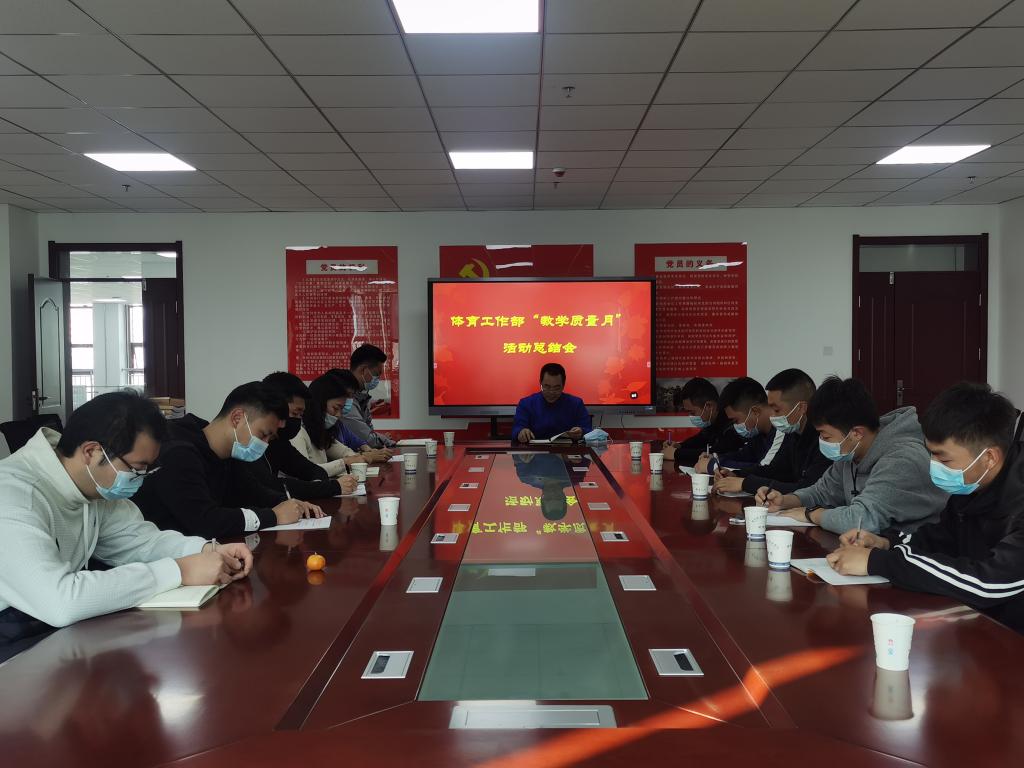 为响应落实甘肃机电职业技术学院2021年“教学质量活动月”活动,体育工作部2021年12月28日下午五六节课,开展了“教学质量活动月”活动总结会,专题讨论总结本次为期一个月的“教学质量活动月”活动。会议上,各位参赛教师踊跃发言,就本次活动的心得体会、收获和缺憾一一进行了梳理,大家纷纷表示,这是一次成功的活动。对于提高各位教师教学质量活动意识、把教学质量放在第一位起到了重要的推动和提升作用。在今后的教学中,我们一定要注重教学质量,向课堂要效率,在激发学生兴趣和运动内容的多样性上下功夫。