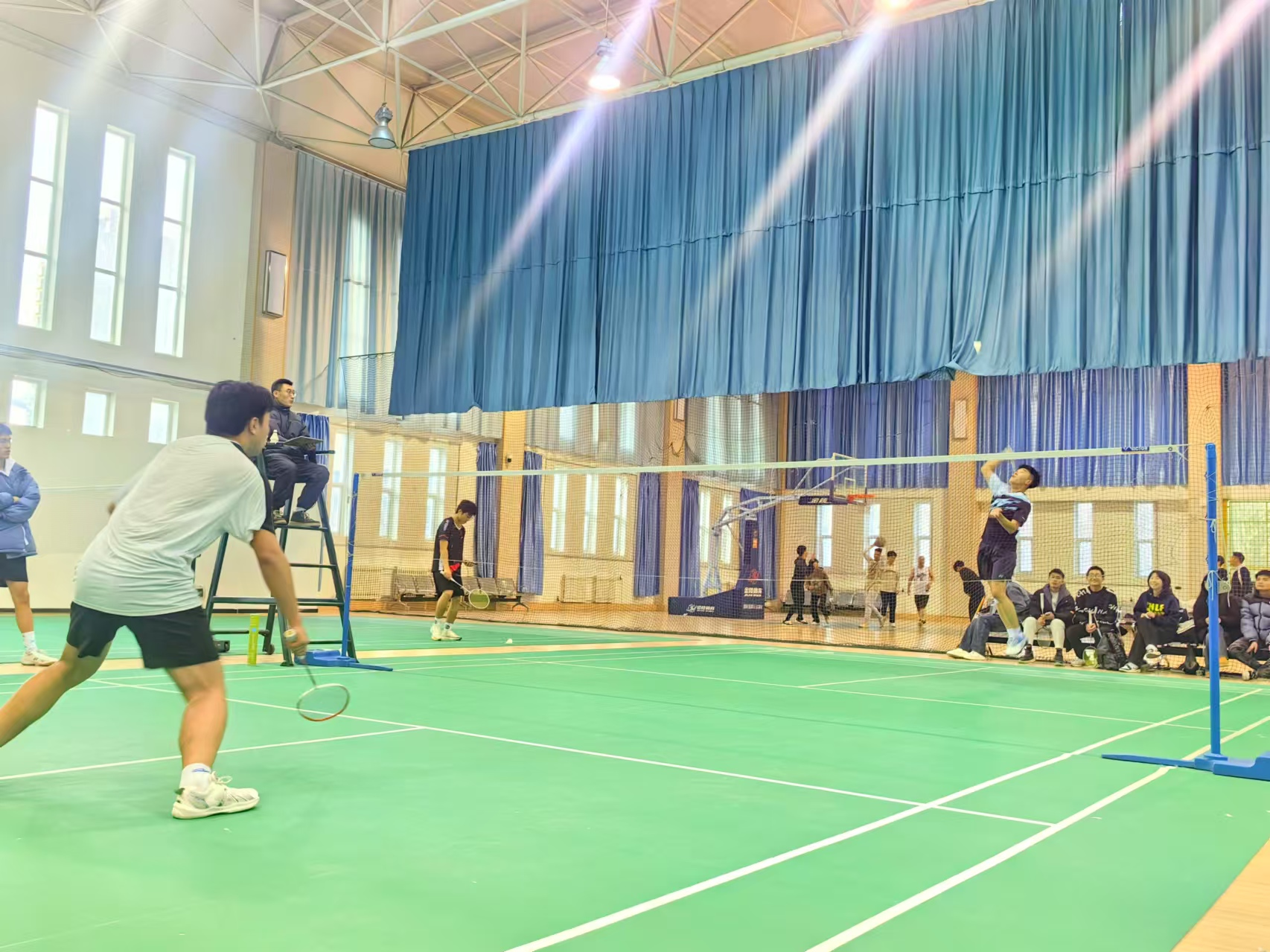 本次比赛混合团体赛采用单循环制,有男子单打、男子双打、女子双打和混合双打等多个项目,吸引了来自各学院的羽毛球爱好者积极参与,比赛在紧张而热烈的氛围中拉开帷幕。赛场上,选手们全神贯注地投入到比赛中。他们发球精准、接球巧妙、脚步灵活、配合默契、时而腾空扣杀,时而轻盈吊球,展现出极高的竞技水平和良好的运动风貌。场下观众也被选手们的精彩表现所吸引,不时爆发出热烈的掌声和欢呼声,为选手们加油助威。